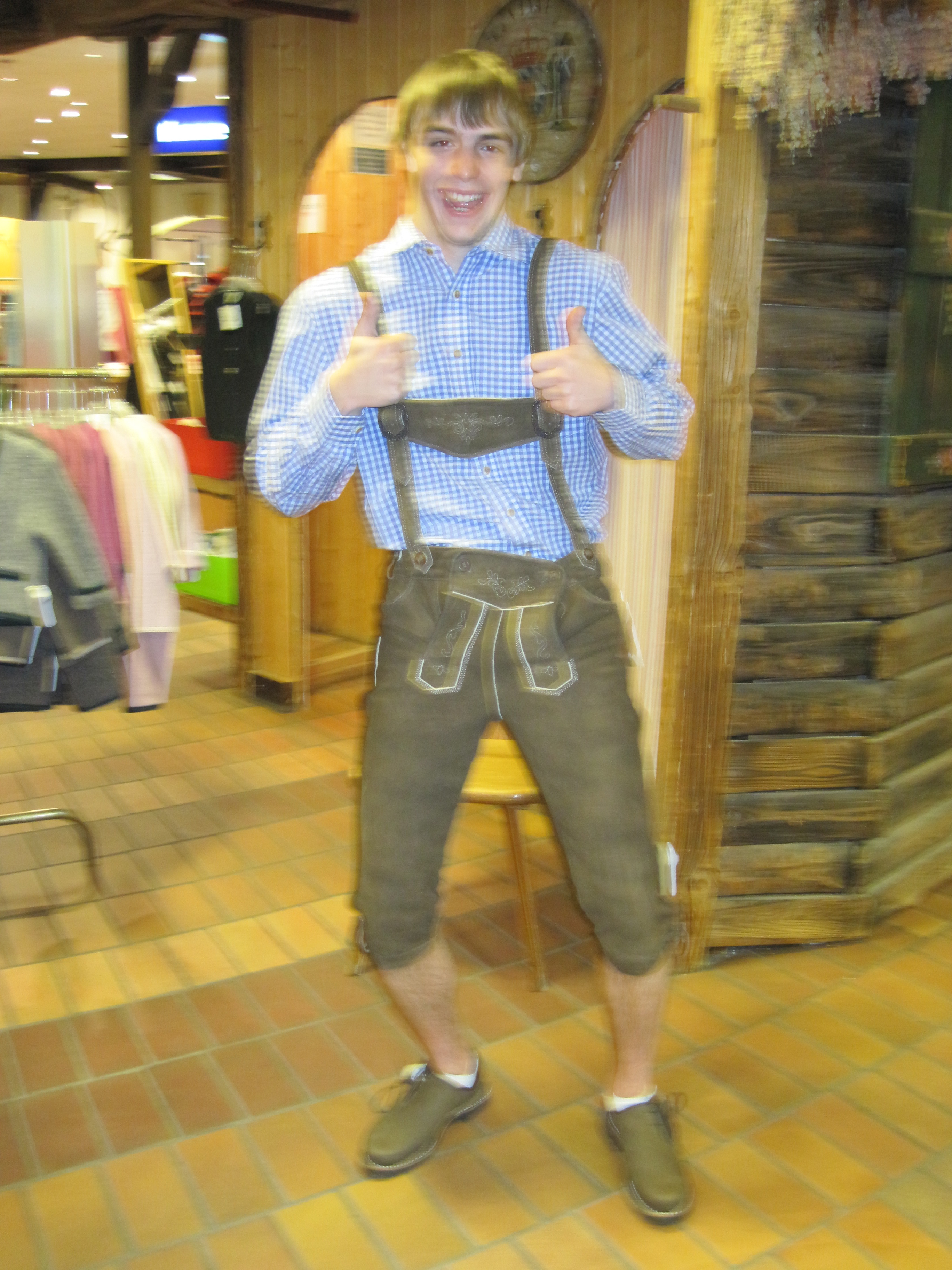 On a happier note — Also on our last day, we bought a ton of candy and can’t wait to share it. In the same department store, there was a huge department for the traditional Bavarian clothes: dirndls and lederhosen. Doug tried on some lederhosen.