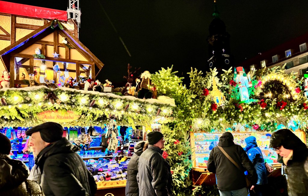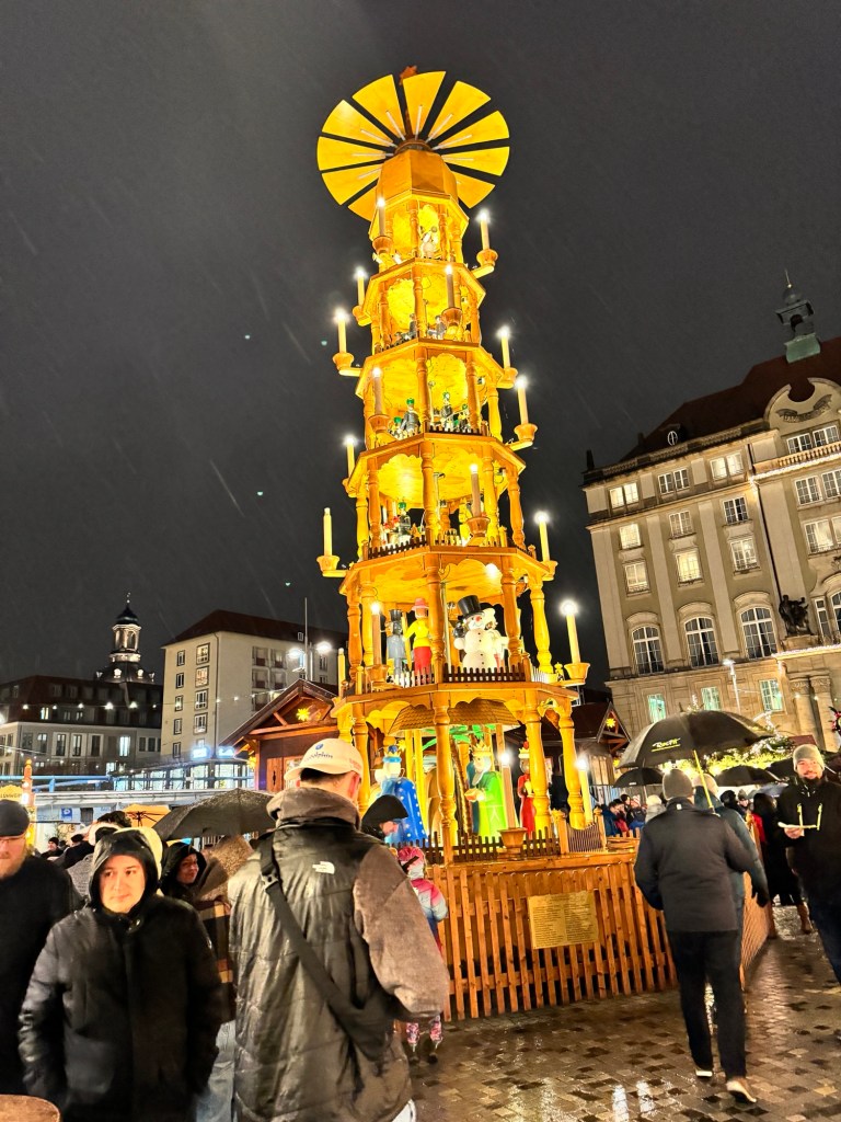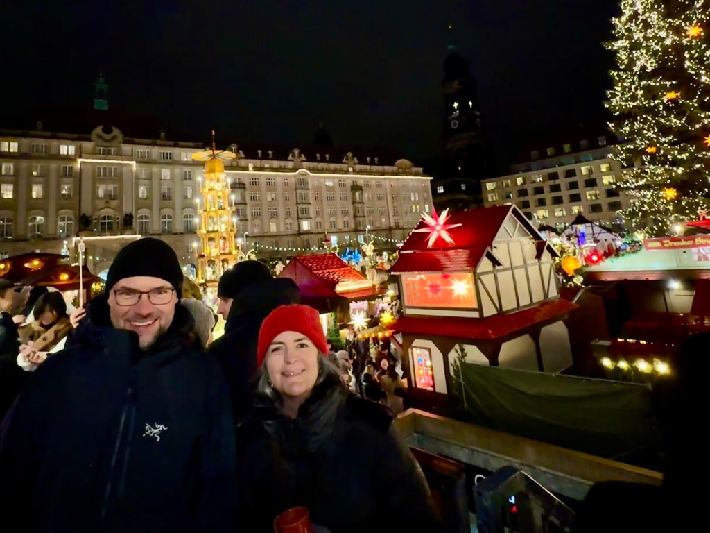 Mathias joined us for an evening excursion to Striezelmarkt, Germany’s oldest Christmas market dating from the 1400s. It was quite a sacrifice for him, as the weather was blustery, cold and rainy. But Mathias said it was the right weather for Striezelmarkt so visitors could truly enjoy the glühwein and bratwurst.