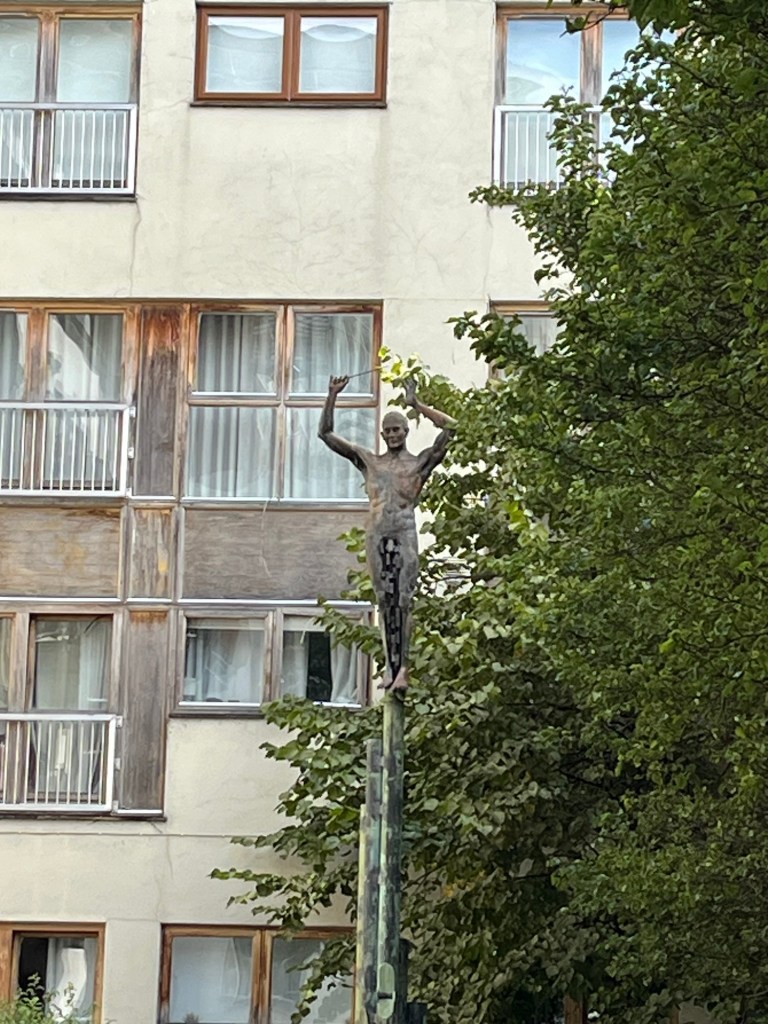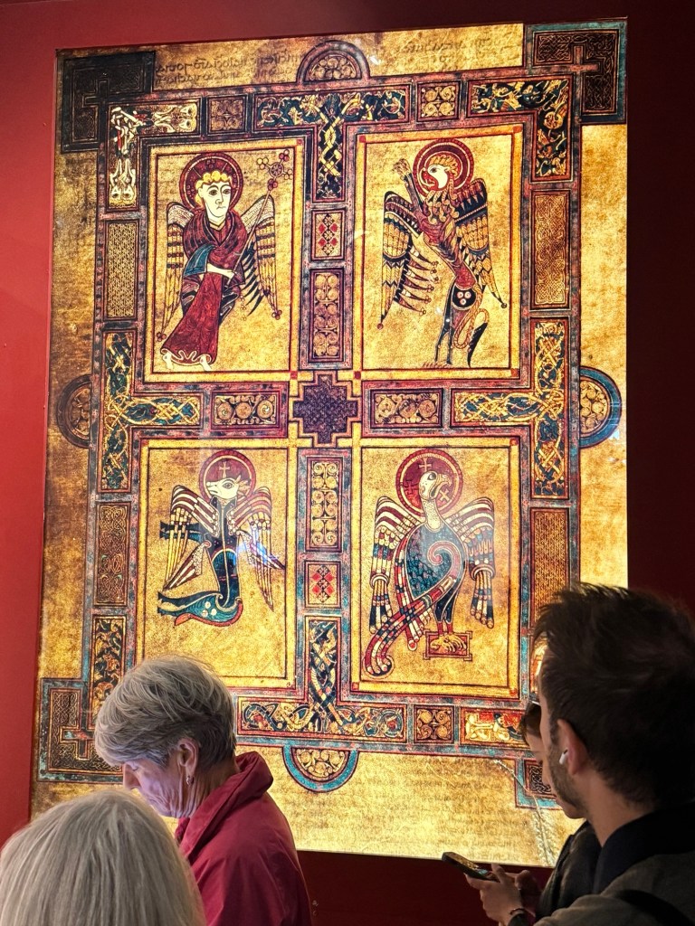 We saw the Book of Kells and the Gaia sculpture. Most of us were a little underwhelmed with the Book of Kells. Somehow we missed the fact that it would only be two pages. The book was open flat in a glass case, with two facing pages showing. But at least they picked two important pages: Jesus’ death and resurrection. The resurrected Jesus was often displayed with peacock feathers because they thought peacock flesh did not decay.