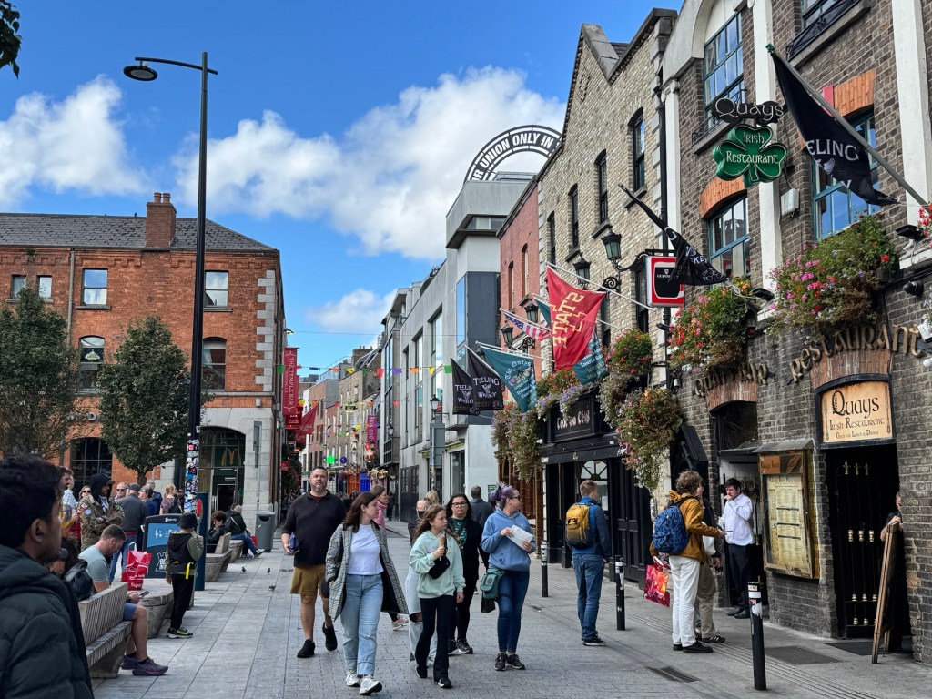 We meandered through the Temple Bar area, now some what touristy, but nonetheless delightful. A couple of weeks ago, an NCAA college football game was held in Dublin – Iowa State vs. Kansas State. There was still an Iowa State flag outside one of the bars.