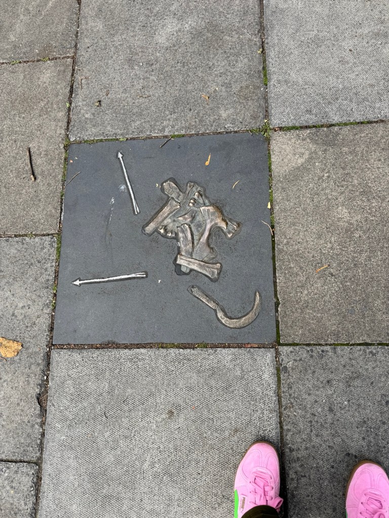 Continuing our walk, we noticed tiles embedded in the sidewalk in places. Apparently, when a big office building was being built for the Dublin City Council in 1978, a Viking settlement was discovered. The building was built anyway, and these commemorative tiles were embedded as a way to acknowledge the history.