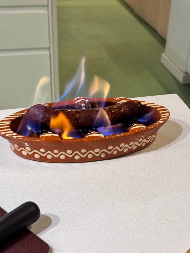 We also had sausage, cheese and olive oil with bread. Teresa set the sausage on fire before cutting it.