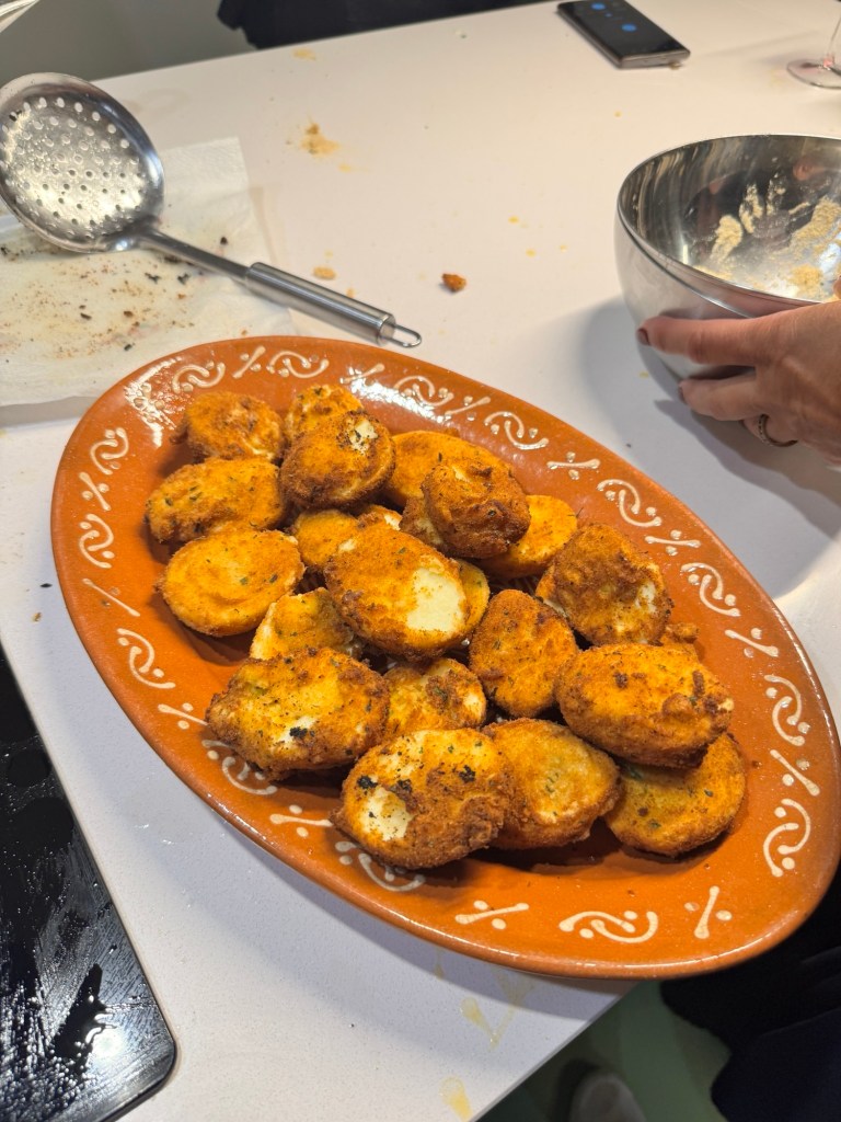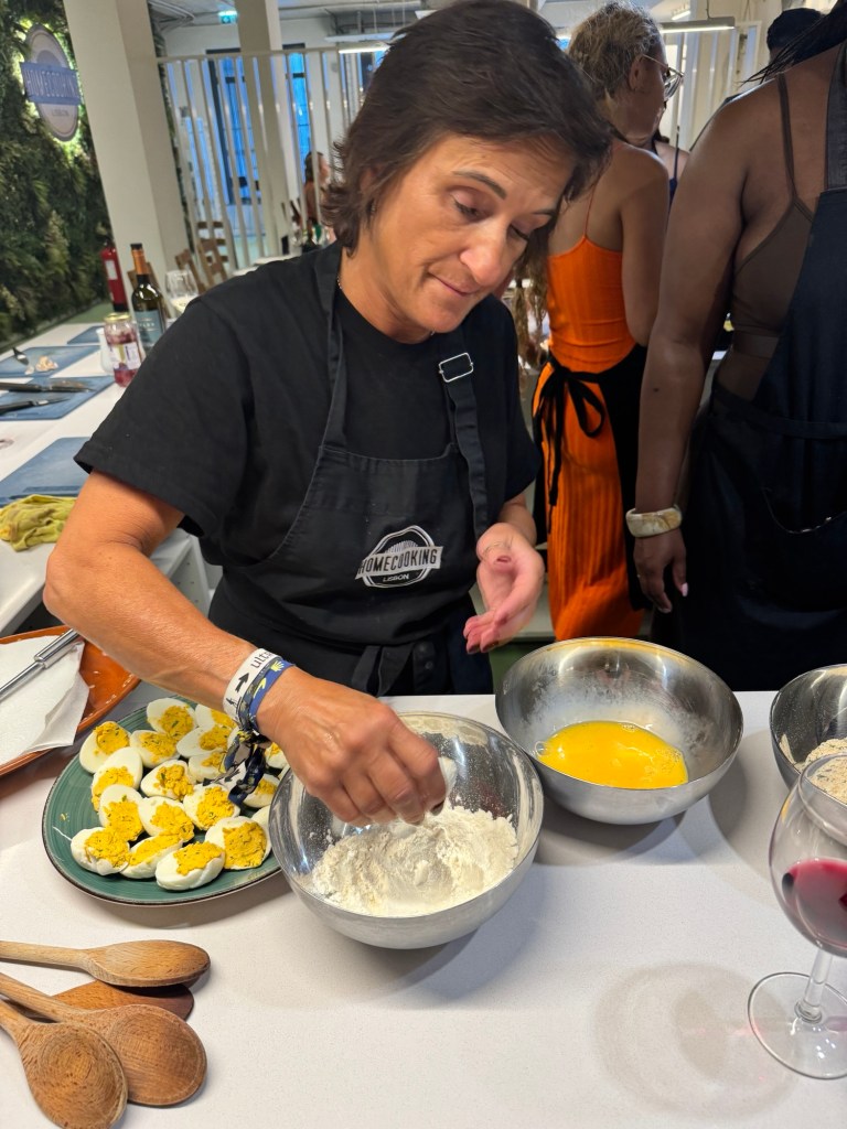 Then we split up into groups, with each group assigned a dish. I helped make these deep-fried deviled eggs called Ovos Verdes. Teresa said this is a common dish served at picnics and parties, partly because it keeps week without refrigeration. This version uses olive oil, not mayo, in the yolk mixture.